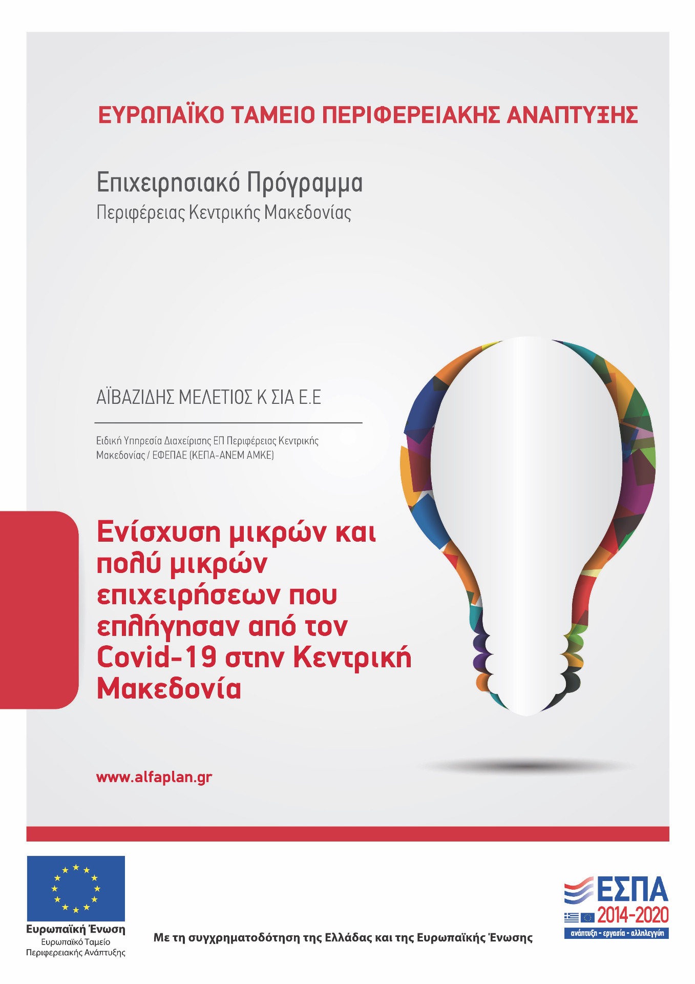 Η επιχείρηση Αϊβαζίδης Μελέτιος κ ΣΙΑ Ε.Ε που εδρεύει στην Περιφέρεια Κεντρικής Μακεδονίας, εντάχθηκε στη Δράση «Ενίσχυση μικρών και πολύ μικρών επιχειρήσεων που επλήγησαν από τον Covid-19 στην Κεντρική Μακεδονία» συνολικού προϋπολογισμού 200 εκ. ευρώ. Η Δράση στοχεύει στην παροχή ενίσχυσης των πολύ μικρών και μικρών επιχειρήσεων της Περιφέρειας Κεντρικής Μακεδονίας με τη μορφή της μη επιστρεπτέας επιχορήγησης για τη διασφάλιση επαρκούς ρευστότητας για την αντιμετώπιση των επιπτώσεων της πανδημίας Covid-19. Ο συνολικός προϋπολογισμός (100% Δημόσια Δαπάνη) της επένδυσης είναι 50.000 €, και συγχρηματοδοτείται από το Ευρωπαϊκό Ταμείο Περιφερειακής Ανάπτυξης (ΕΤΠΑ) της Ευρωπαϊκής Ένωσης (ΕΕ) και Εθνικούς Πόρους στο πλαίσιο του Επιχειρησιακού Προγράμματος «Κεντρική Μακεδονία» 2014-2020.